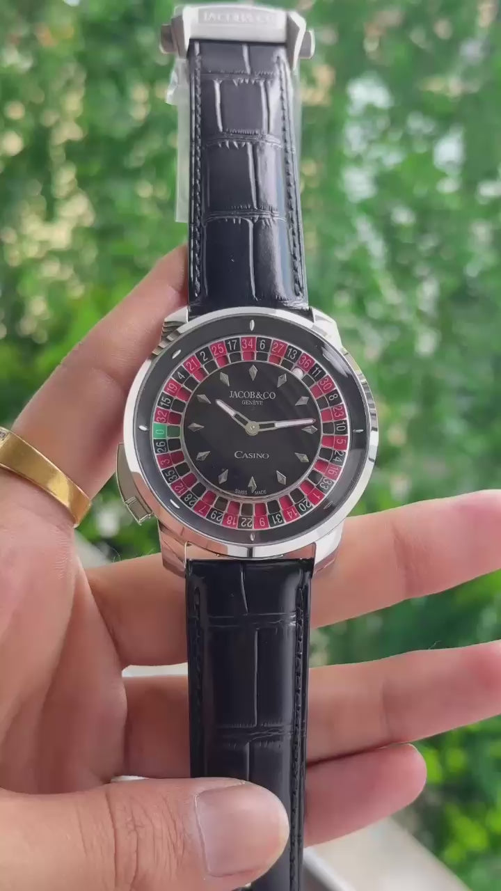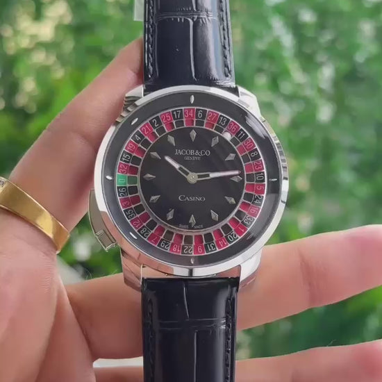 The roulette-style center dial spins with a press of the button — mimicking the real casino experience. Its sleek black onyx-inspired base and refined rose gold case make it a true conversation starter.