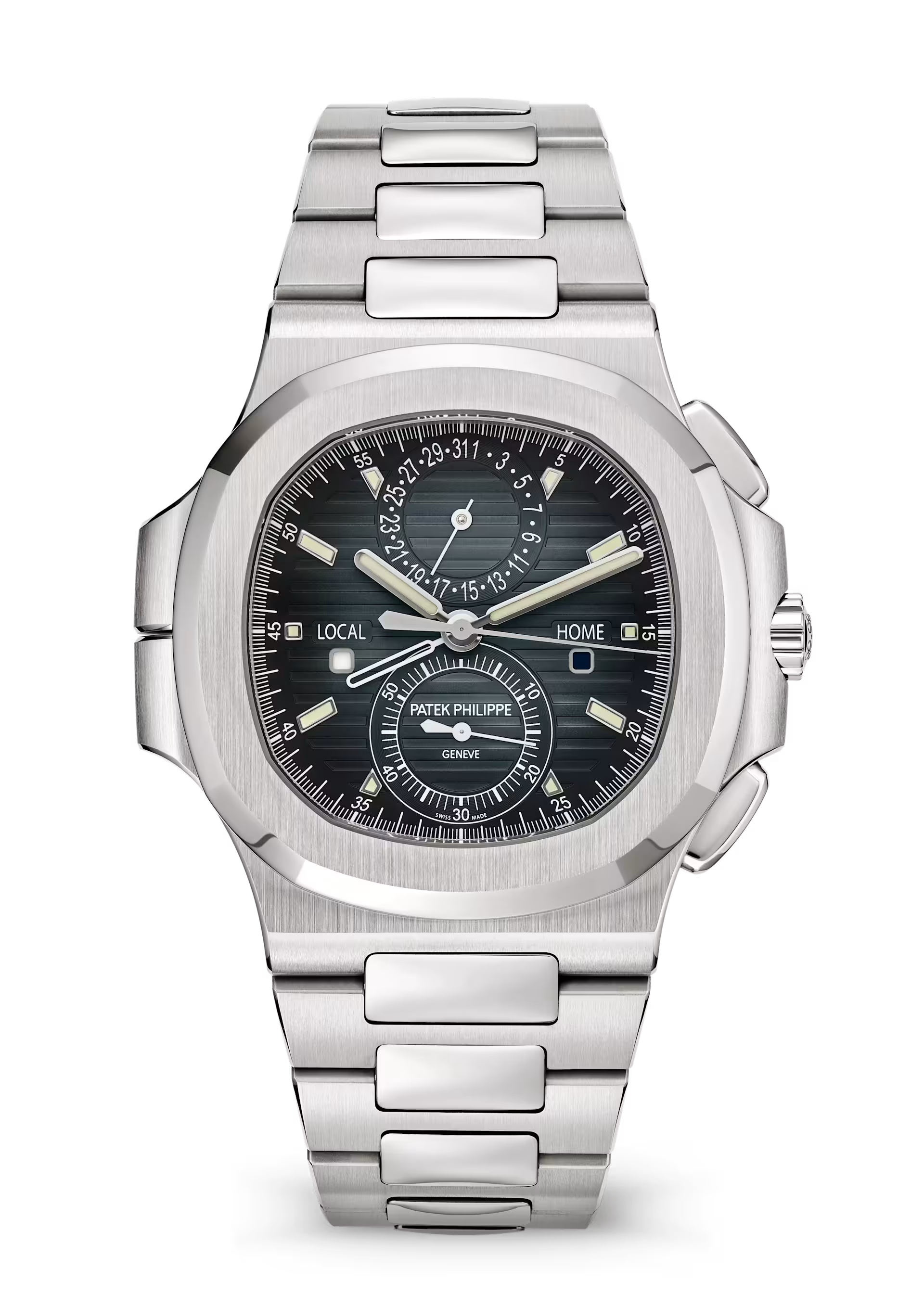 Nautilus-Inspired Steel Watch – Flyback Chronograph, Dual Time Zone & Date Hand